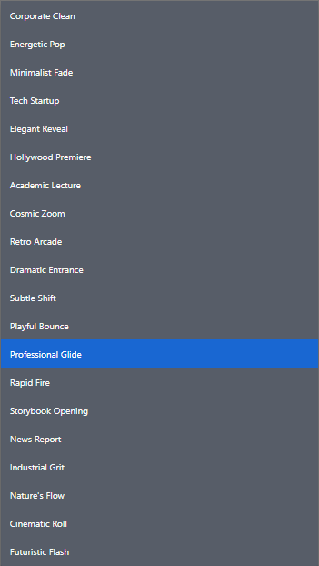 The app provides a list of pre-configured “packaged” animation presets that apply a cohesive style to a presentation. The one currently highlighted and in use is “Professional Glide.”