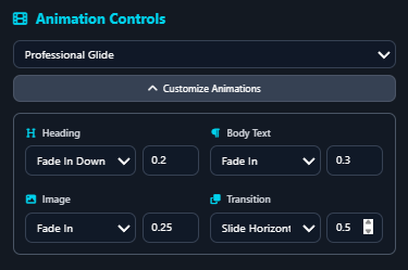 The “Customize Animations” section allows you to fine-tune the specific effects and timings for different elements within the presentation slide. The image shows the custom settings applied to the “Professional Glide” preset: i.e.